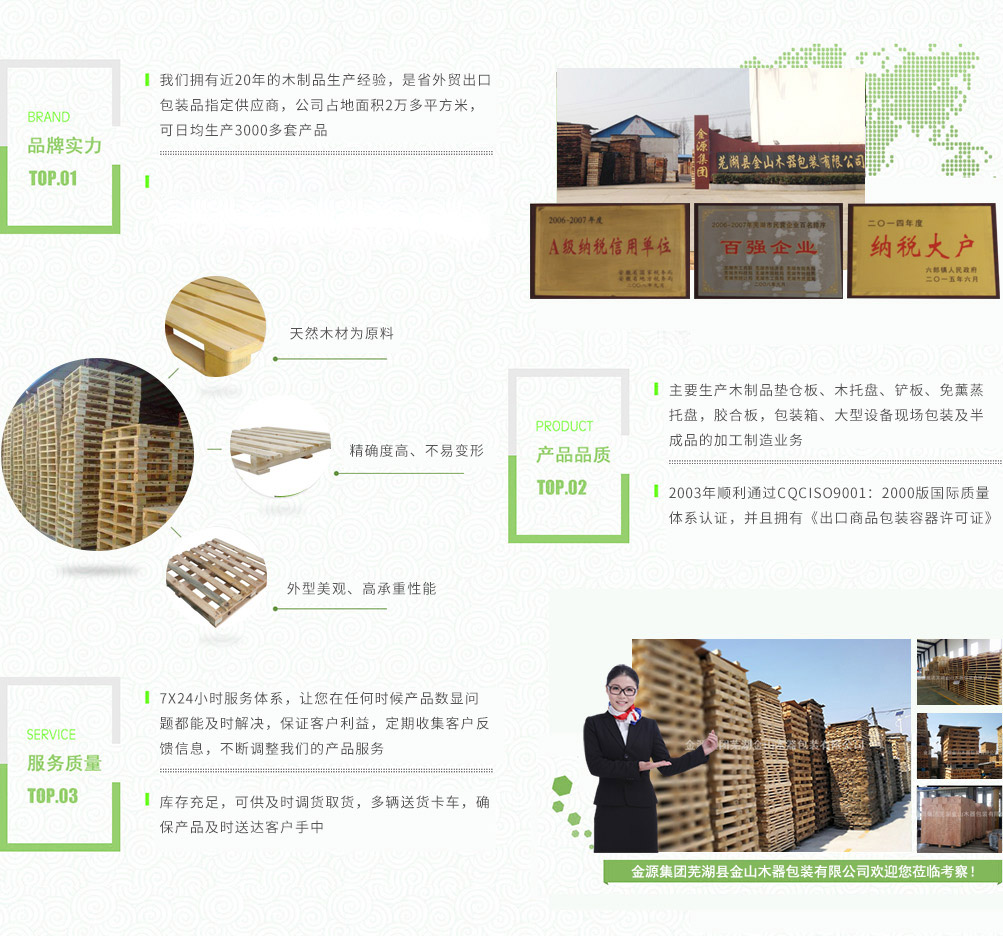 金源集團蕪湖金山木器包裝有限公司是省外貿(mào)出口包裝品指定的供應商,主要生產(chǎn)木制品墊倉板、木托盤、鏟板、免薰蒸托盤,膠合板,包裝箱、大型設(shè)備現(xiàn)場包裝及半成品的加工制造業(yè)務。產(chǎn)品廣泛用于物流,倉儲,港口,碼頭,機械,建材,化工,紡織,食品,超市,五金電器等行業(yè)。公司占地面積2萬多平方米,注冊資金壹佰壹拾捌萬圓整,公司擁有員工160多人,其中技術(shù)人員占25%,可日均生產(chǎn)3000多套產(chǎn)品,年產(chǎn)值6000多萬元,公司下轄木材加工廠,組裝廠,并備有大型標準烘房,多功能平板刨,壓刨,挖槽,機械設(shè)備等。產(chǎn)品主要銷往國內(nèi)大中型城市并隨貨通行出口國外。